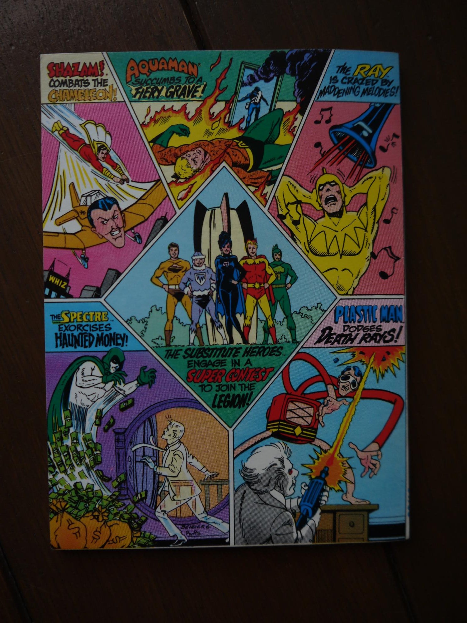 Agent Pinkeye is revealed as the killer of Dimitri Dervish and is captured by Plas and Woozy. Part I: The Super-Villains of All Ages!--Tales of the Legion of Super-Heroes, script by Edmond Hamilton, art by John Forte; Rejected applicant Alaktor steals a Time Bubble and recruits the help of Nero, Dillinger, and Hitler to battle the Legion. Part 2: The Civil War of the Legion!--Tales of the Legion of Super-Heroes. The Chameleon Stone! starring Captain Marvel, script by William Woolfolk, art by C. C. Beck. The Ghost that Haunted Money! starring the Spectre, script by Gardner Fox, pencils by Jerry Grandenetti, inks by Murphy Anderson. Untitled Ray story, art by Lou Fine [as E. Lectron]. As the Seas Die starring Aquaman, script by Steve Skeates, art by Jim Aparo.