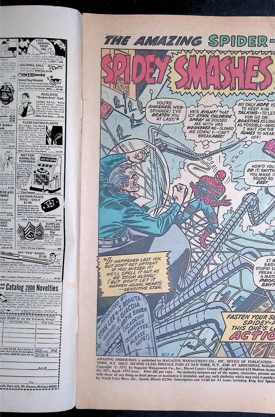 "Spidey Smashes Through!" Part 3 of 3. Script by Stan Lee. Pencils by John Romita. Inks by Frank Giacoia and Tony Mortellaro (backgrounds). Cover by John Romita and Frank Giacoia.