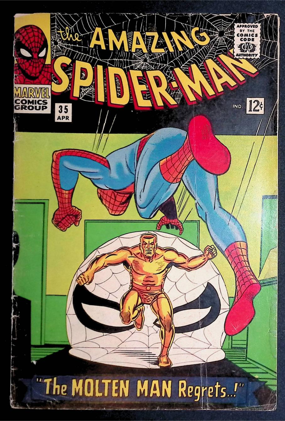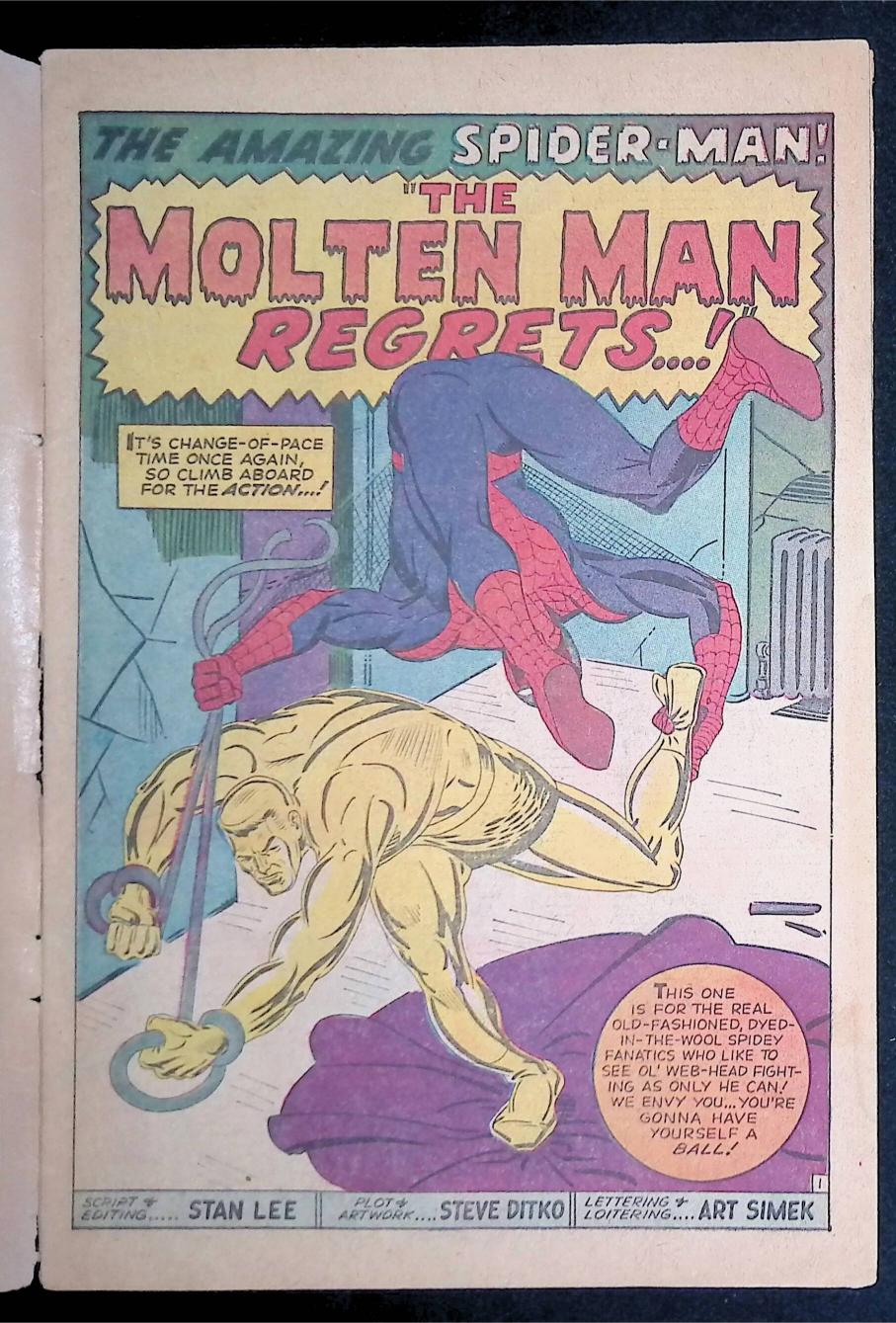 Cover pencils by Steve Ditko and Jack Kirby (Spider-Man figure), inks by Steve Ditko and Sol Brodsky (Spider-Man figure). The Molten Man Regrets...!, script by Steve Ditko (plot) and Stan Lee (script), art by Steve Ditko