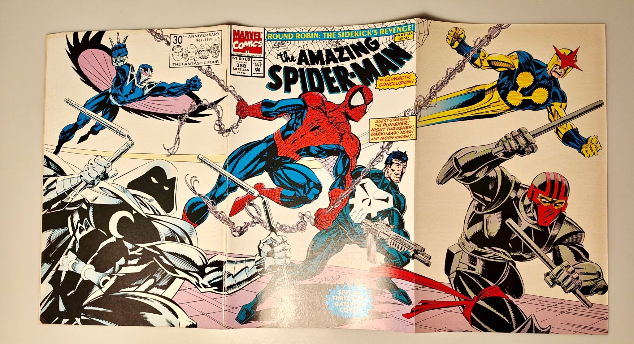 "Out on a Limb" Round Robin: The Sidekick's Revenge Part 6 of 6. Guest-starring Moon Knight, Darkhawk, Night Thrasher, Nova, and the Punisher. Script by Al Milgrom. Pencils by Mark Bagley. Inks by Randy Emberlin. Cover by Mark Bagley and Al Milgrom.