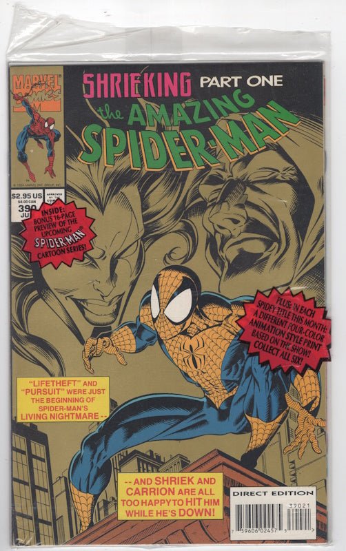 Poly-Bagged Edition. This special polybagged issue includes a 16-page preview of the Spider-Man cartoon series and a color "animation style print" (looks a little like an animation cel) of Spidey versus Venom! As for the comic itself, Shriek and Carrion guest star in "Behind the Walls." Script by J.M. DeMatteis, pencils by Mark Bagley, inks by Randy Emberlin. Green Goblin cameo (well, his mask, anyway).