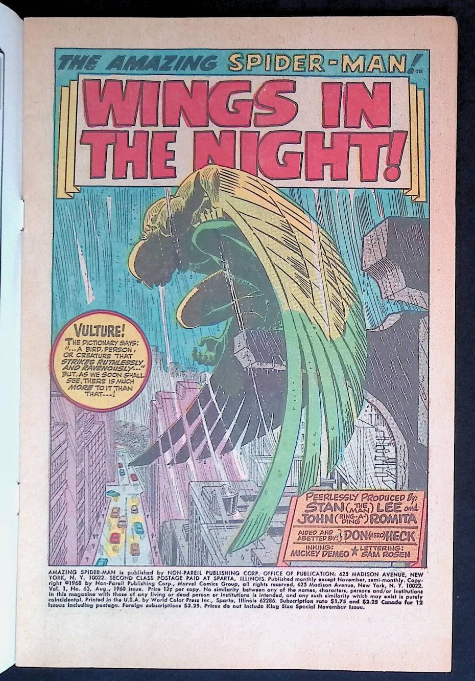 "Wings in the Night!" Part 1 of 2. Script by Stan Lee. Art by John Romita (layouts) and Don Heck (pencils). Inks by Mike Esposito (as Mickey Demeo). Cover by John Romita.