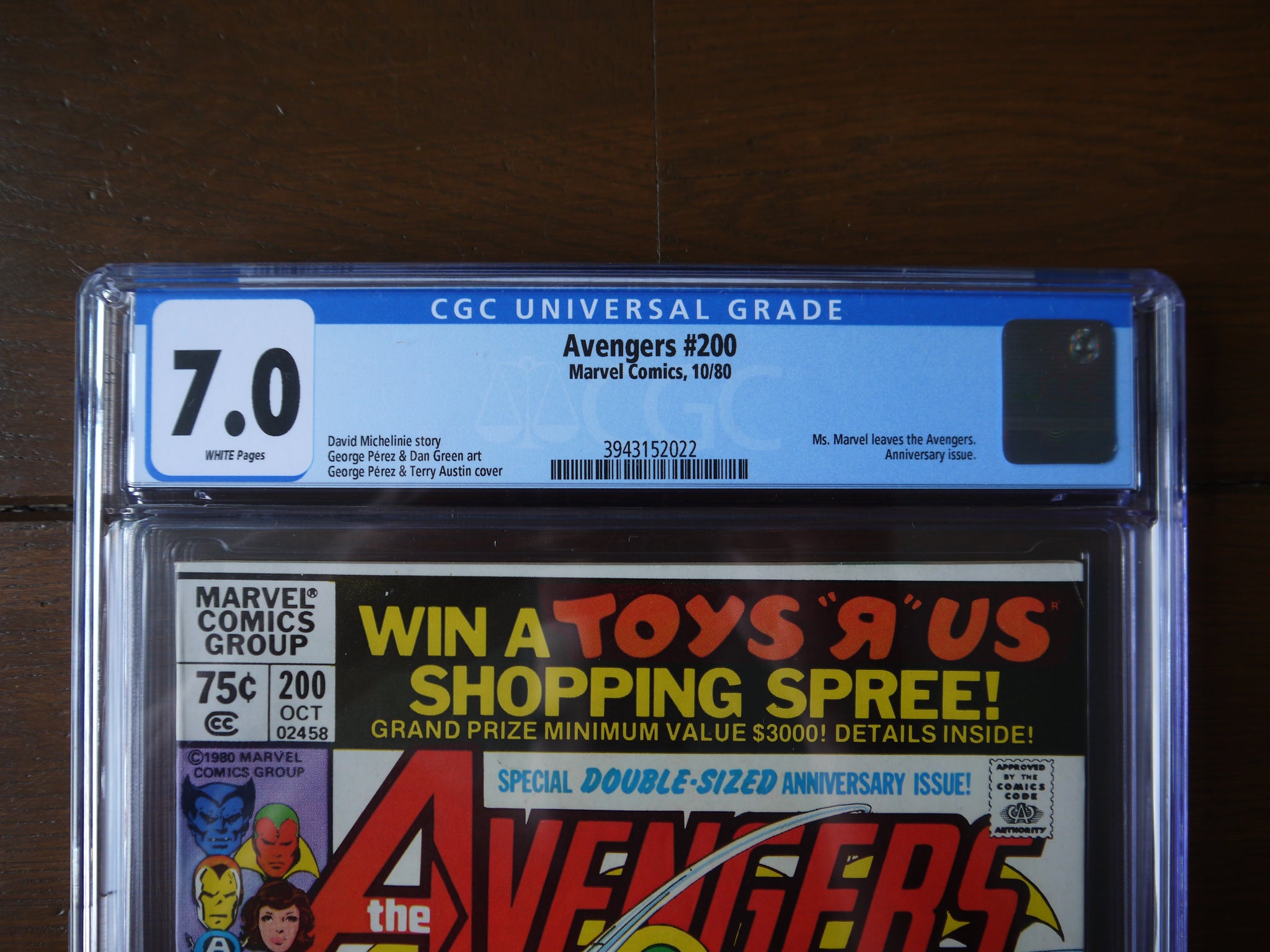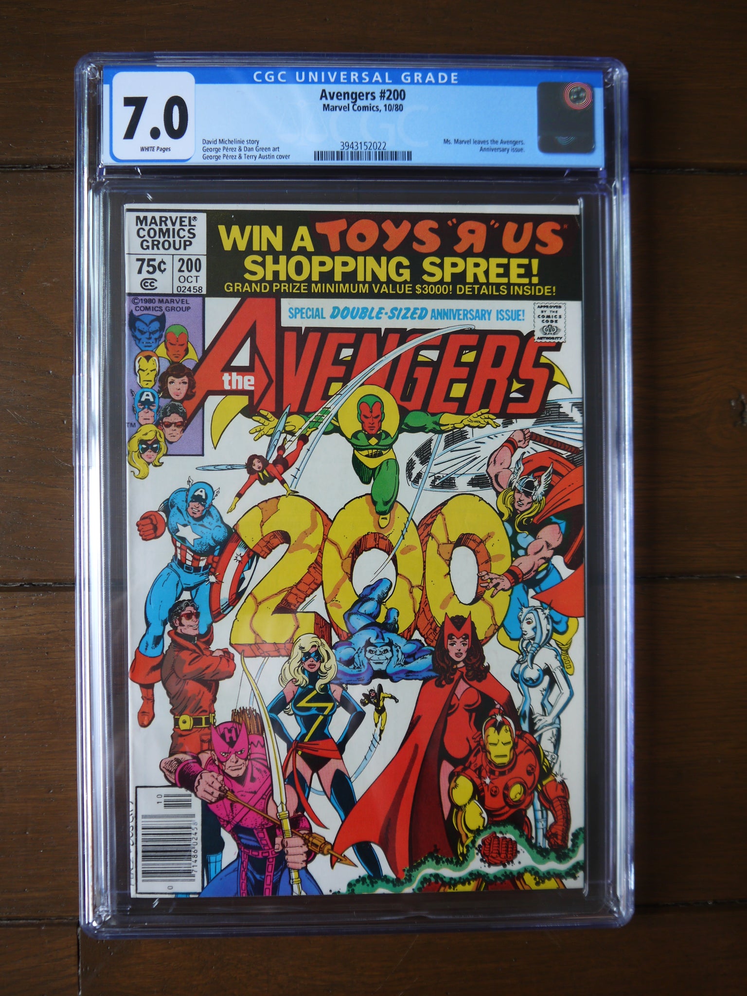 It's the bicentennial issue of Earth's Mightiest Heroes! However, the mood at Avengers Mansion is bittersweet as Ms. Marvel gives birth to a healthy baby boy after a bizarre three-day pregnancy. Something very strange has happened to Carol Danvers, but Dr. Donald Blake and Hank Pym cannot determine what. Something else rather strange is also happening to New York City...prehistoric dinosaurs, medieval knights, and alien spaceships! Where in the world, or perhaps, when in the world did they come from?!? One avenger has a strong suspicion...the now full-grown son of Carol Danvers! When Hawkeye confronts "Marcus" and his mysterious machine, the truth is revealed! Will the truth bring a happy ending to everyone involved...or just appear to? First and final appearance of Marcus Immortus. Flashback cameo by Immortus. Avengers Lineup: Beast, Captain America, Iron Man, Hawkeye, Jocasta, Ms. Marvel, Scarlet Witch, Thor, Vision, Wasp, Wonder Man, and Yellowjacket.