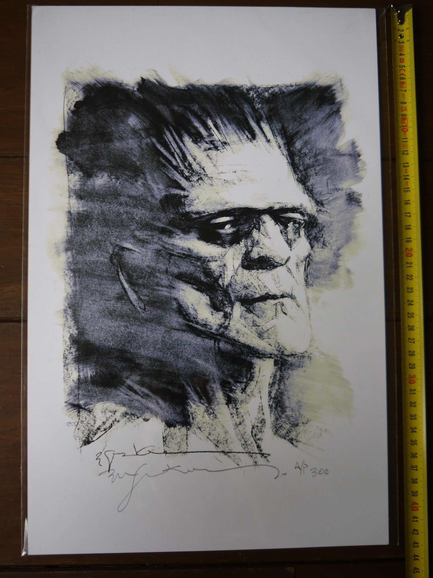 this listing is for one signed print from comic artist Bill Sienkiewiczthe subject matter is a portrait of Frankenstein. the artwork / print measures 11' x 17"this piece is signed in the plate (i.e. a reproduced signature from the original art) and hand signed by Bill Sienkiewicz & numbered in graphite at the bottom.