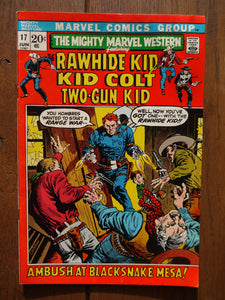 Kid Colt Outlaw stars in an untitled swtory (art by Jack Keller); Two-Gun Kid stars in "Championship Rodeo" (script by Stan Lee, art by John Severin). New Severin cover.