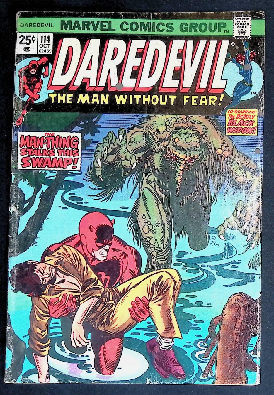 The Man-Thing attacks Gladiator in the Florida swamp while DD takes on the Death-Stalker and learns first hand about his icy touch of death; DD and Rory are tied up in an old shack which the Gladiator tries to burn down around them as he makes off with Candice; Man-Thing stops him but Death-Stalker escapes with Foggy's sister. Appearance by the Black Widow. Letter to the editor from comics artist Richard Howell. The letters page also contains Marvel Value Stamp series A #7 (Werewolf).