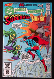 Superman tries to help Man-Bat who is trying to find something that will save his daughter's life in "The Metamorphosis Machine." Script by Martin Pasko and art by Curt Swan & Vince Colletta. Issue also has "Whatever Happened to Rex the Wonder Dog." Script by Mike Tiefenbacher and Art by Gil Kane.