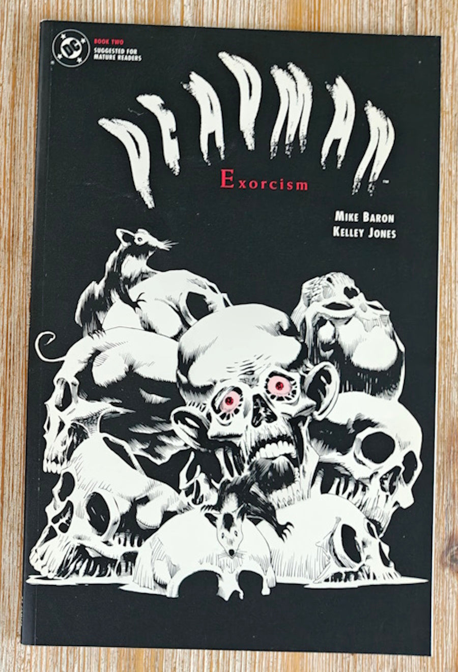 Insanity has at last claimed Deadman as he embraces madness to escape the loneliness of his existence. For the first time, Boston Brand truly becomes a ghost in heart and mind, bitter and vengeful and ready to wreak havoc on any living person unlucky enough to cross his path. DEADMAN: EXORCISM revisits the angst-ridden world of Deadman in his new home, a deserted Vermont church - a church not even he realizes is the deadly nexus of an arcane convergence. Swept into that vortex along with him are the Phantom Stranger, Madame Waxahachie, a trio of evil spirits and a plague of demons seeking to escape from Hell. Written by Mike Baron, with art and cover by Kelley Jones. Prestige Format.