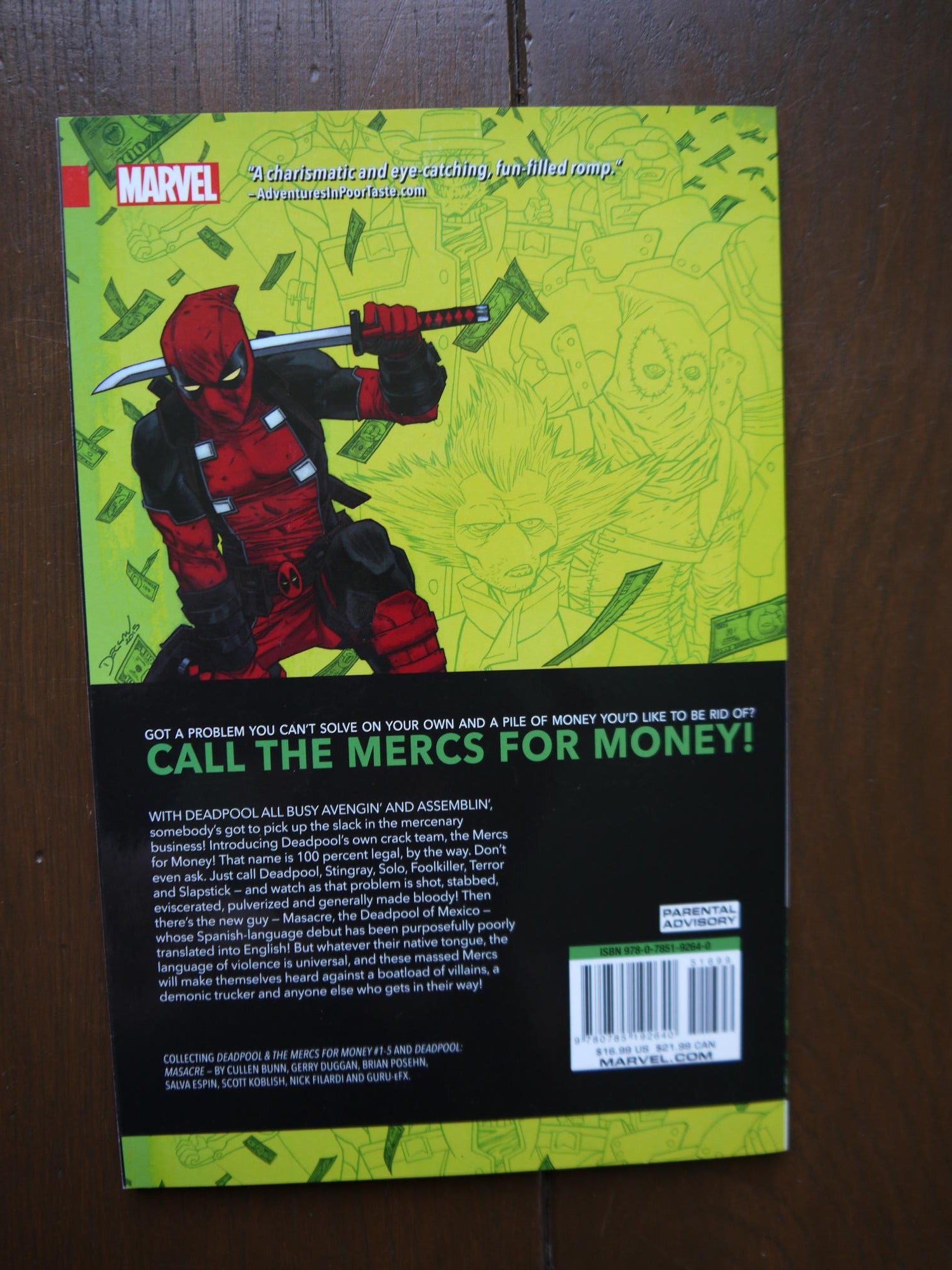 If Deadpool is all busy Avengin' and Assemblin', who's picking up the slack and taking care of mercenary business? How about his own crack team, the legally cleared-to-be-called Mercs for Money! Got a problem you can't solve on your own and a pile of money you'd like to be rid of? Just call Deadpool, Stingray, Solo, Foolkiller, Terror and Slapstick - and watch as that problem is shot, stabbed, eviscerated, pulverized and generally made bloody! Then there's the new guy, Masacre, the Deadpool of Mexico - whose Spanish-language debut has been poorly translated into English! But whatever their native tongue, the language of violence is universal, and these massed Mercs will make themselves heard against a boatload of villains, a demonic trucker and anyone else who gets in their way!