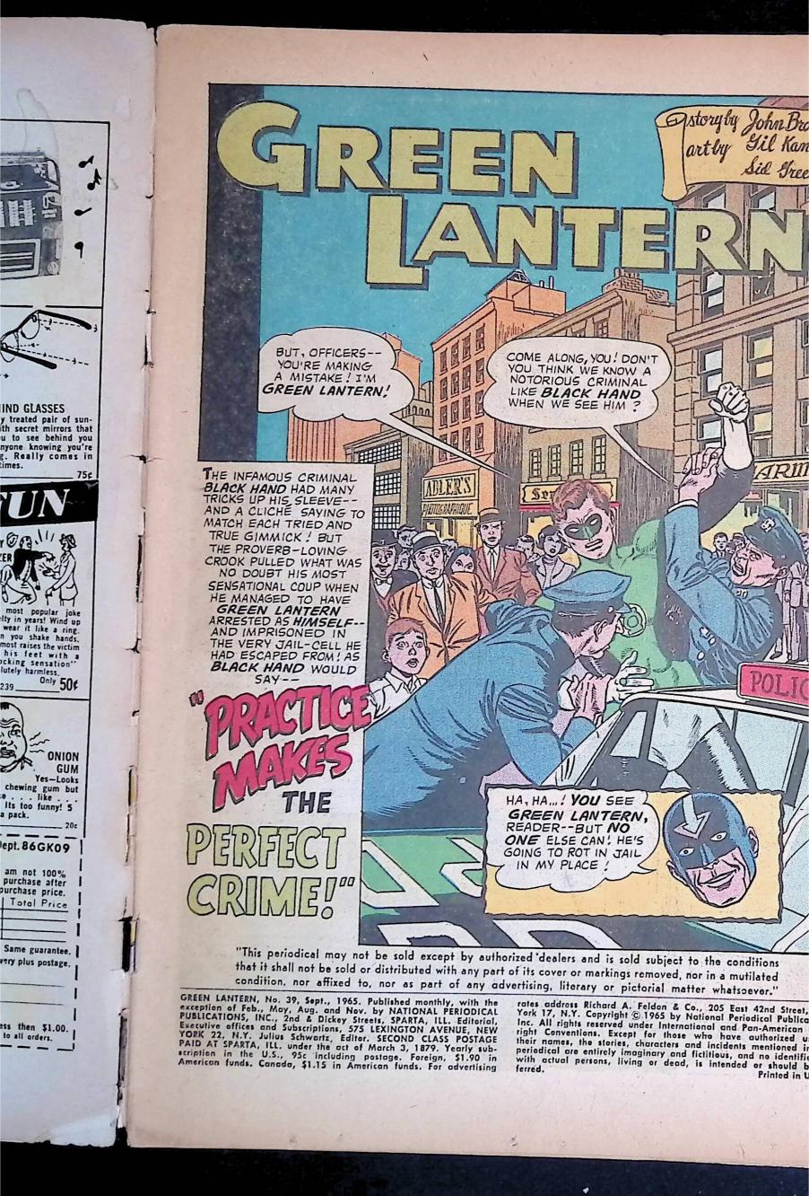 Practice Makes The Perfect Crime, script by John Broome, pencils by Gil Kane, inks by Sid Greene; Black Hand uses he power-light to create the illusion that Green Lantern is Black Hand, leading to GL's arrest for stealing the Dona Maria. The Fight For the Championship of the Universe, script by John Broome, pencils by Gil Kane, inks by Sid Greene; An intergalactic fighting champion wants a shot at Green Lantern.