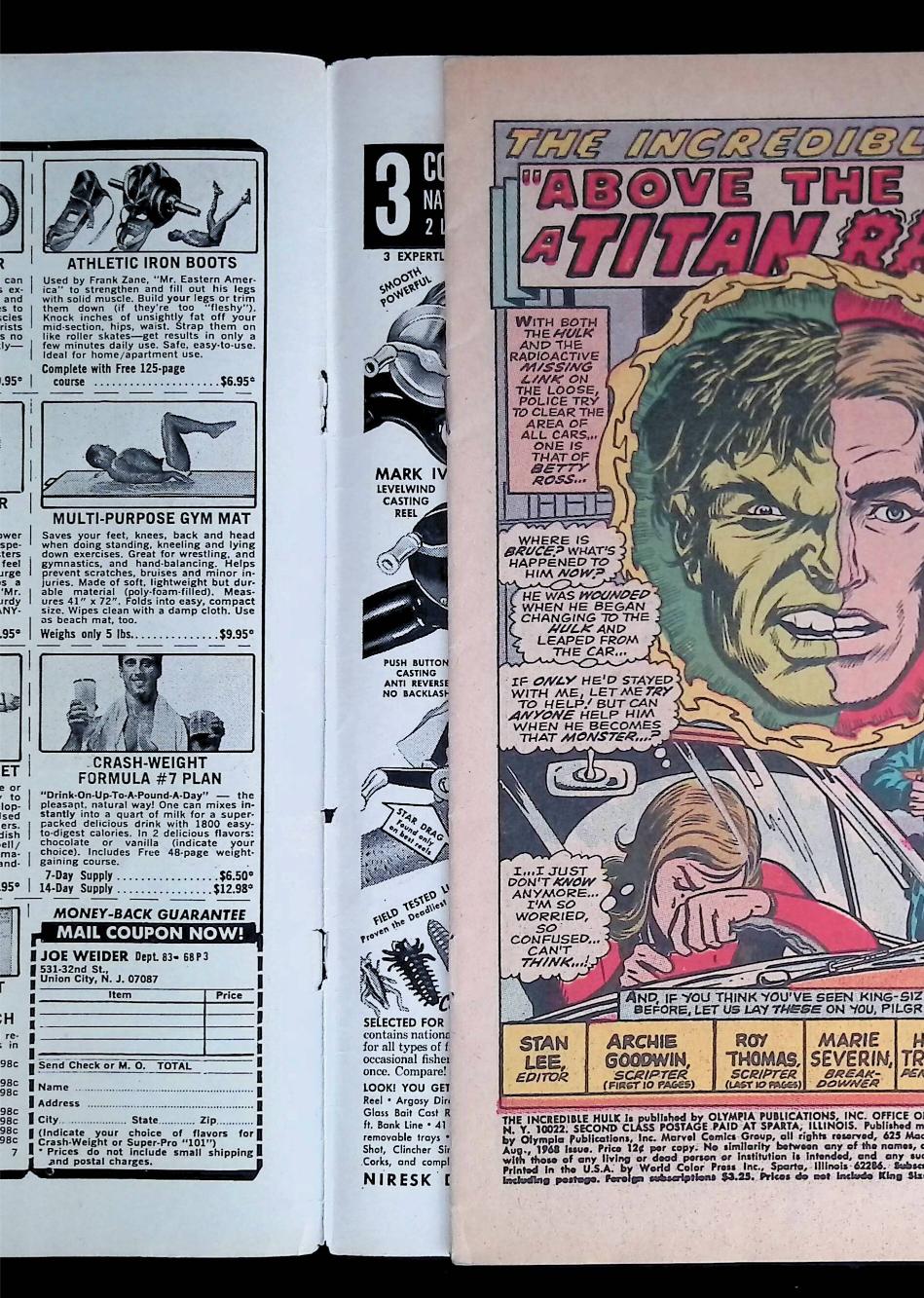 Banner once again becomes the Hulk as the battle with the Missing Link continues; Nick Fury and SHIELD move in to help out Ross in capturing the two monsters; During the fight, what everyone thinks is the helicarrier beams the tusseling titans aboard but it actually turns out to be a Russian ship manned by Brevlov; The Russians test the Missing Link to find out how to use its power but the Hulk escapes his captivity and causes mayhem; The Hulk makes it back to terra firma just as the Missing Link finally overloads on radiation and explodes; Yuri and his men escape their doomed ship in a smaller saucer and even though the Hulk has just saved a small Russian boy from a burning house, Brevlov is pressured by his men to finish off the monster. House ad for the Spectacular Spider-Man #1, art by John Romita. House ad for Not Brand Echh #9, art by Marie Severin.
