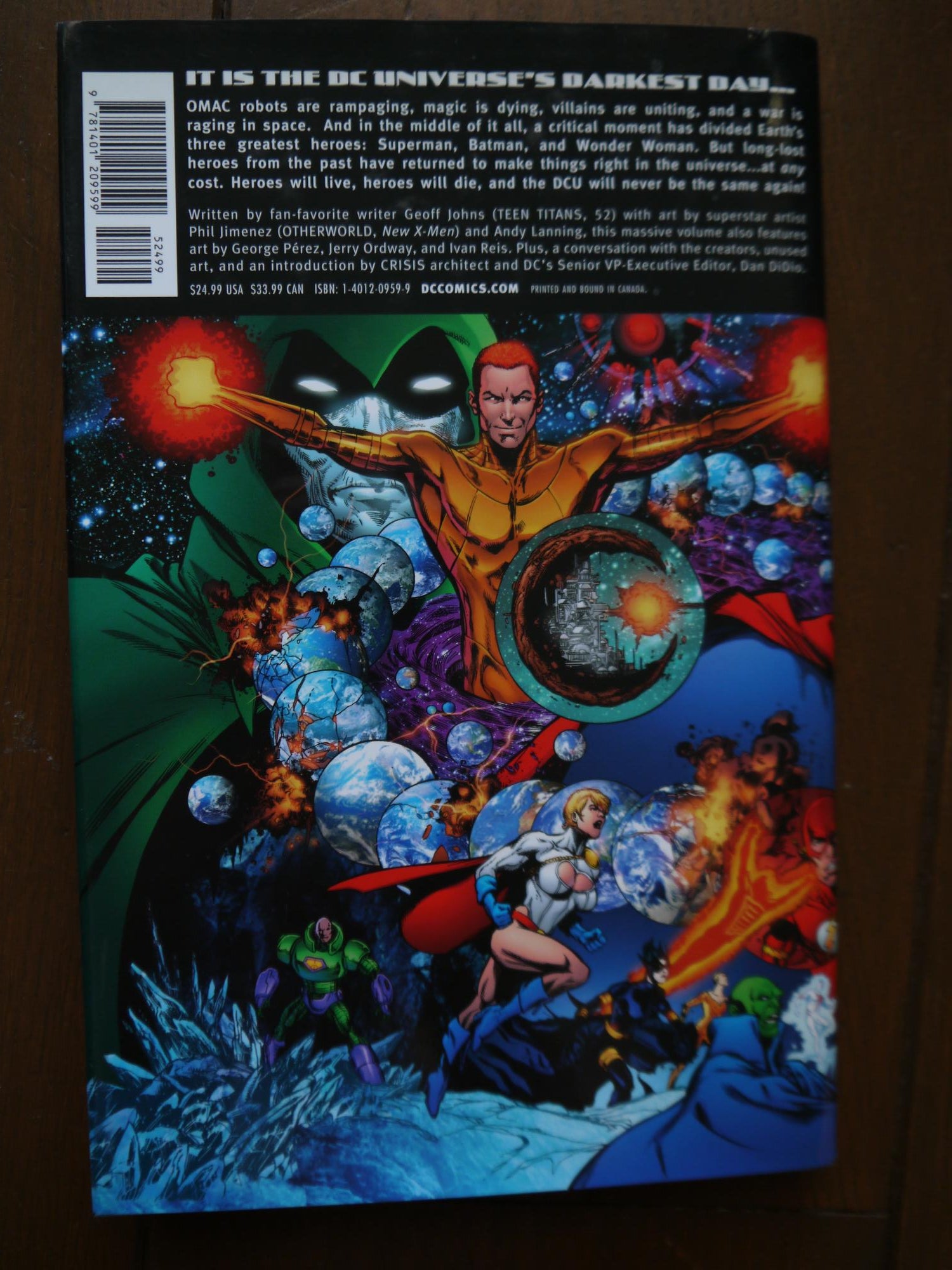 OMAC robots are rampaging, magic is dying, villains are uniting, and a war is raging in space. And in the middle of it all, a critical moment has divided Earth's three greatest heroes: Superman, Batman and Wonder Woman. It's the DCU's darkest day, and long-lost heroes from the past have returned to make things right in the universe...at any cost. Heroes will live, heroes will die, and the DCU will never be the same again! This exhaustive volume also contains every cover and variant produced for the project, annotations, character designs, excerpts from scripts, unused scenes, and much more! Includes previously unseen material.