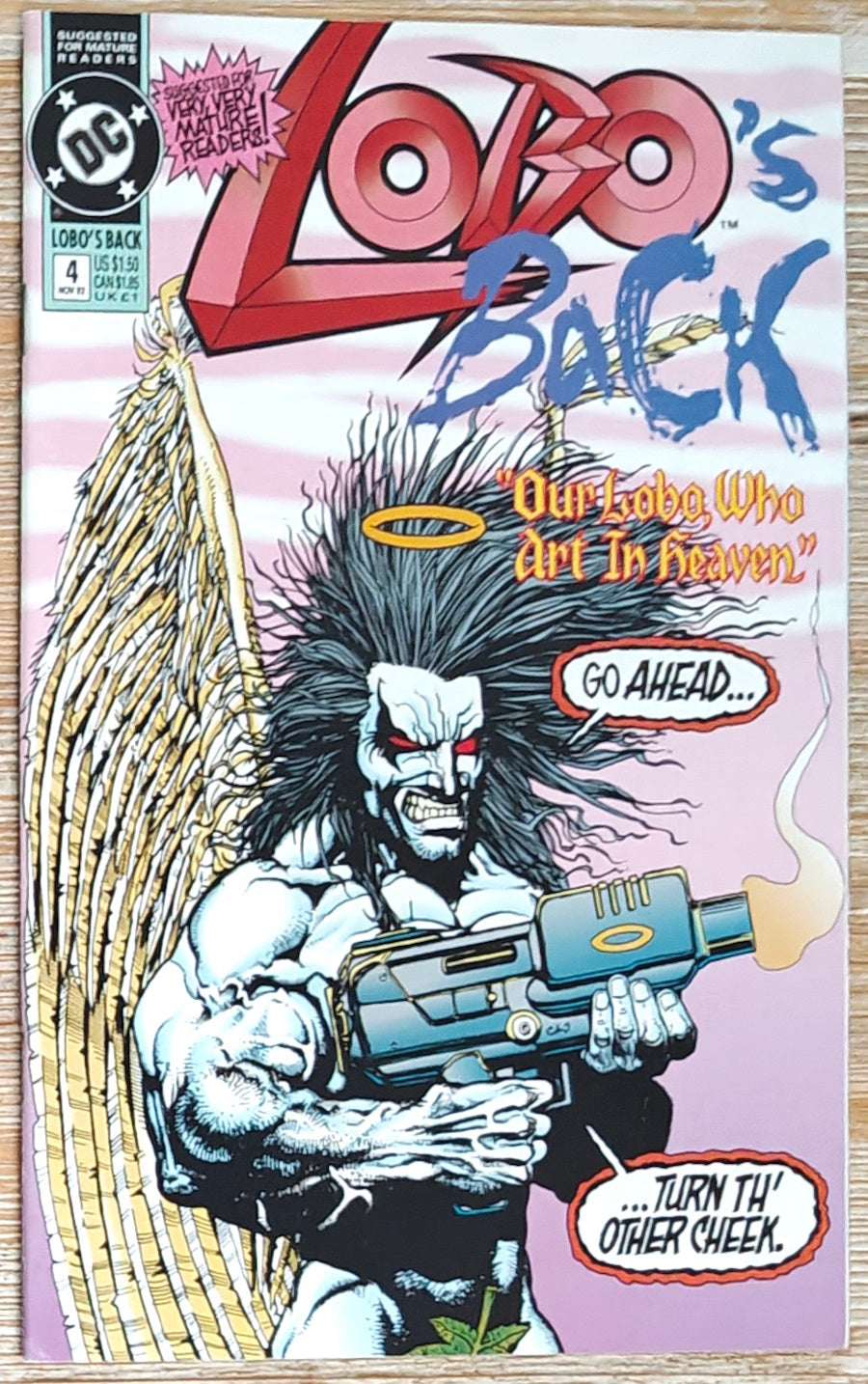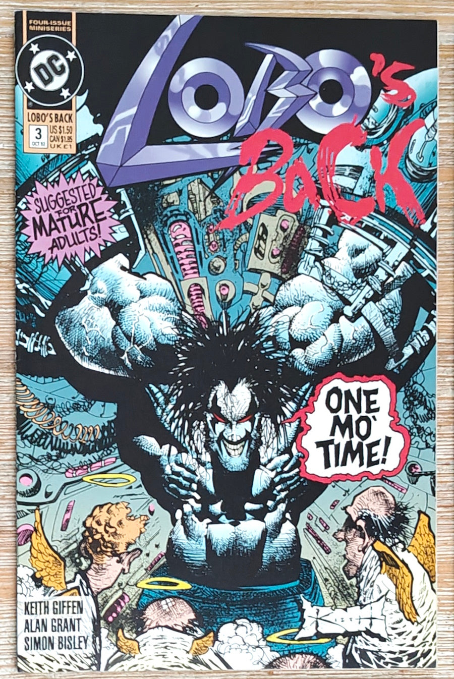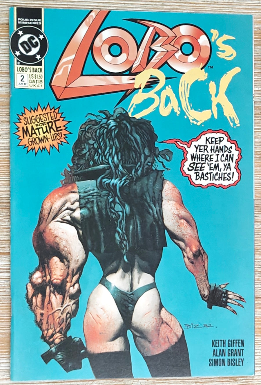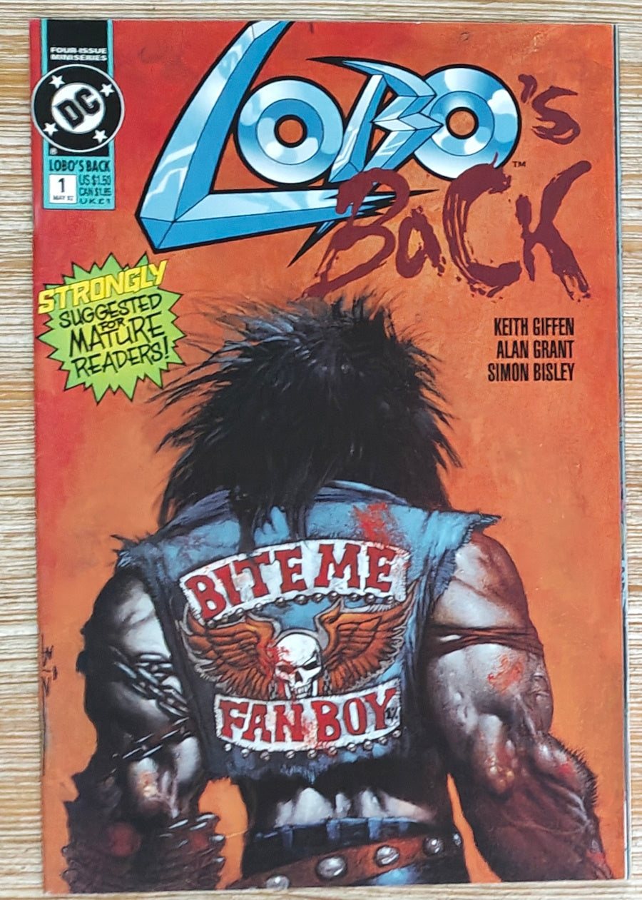 Everybody's favorite bad boy of comics returns! This time Lobo's taken a job as a skip-tracer, courtesy of his old friend Ramona, the skip-tracing hairdresser who's set him on the trail of his bounty, Loo. That's Loo, the self-proclaimed 'baddest bastich in the galaxy'...who may just be a match for Lobo himself. Yeah, right! LOBO'S BACK is a pulse-pounding, action-packed bonanza of violence, hilarity and more violence, brought to you by the creative team responsible for LOBO: THE LAST CZARNIAN and THE LOBO PARAMILITARY CHRISTMAS SPECIAL: writers Keith Giffen and Alan Grant, and artist Simon Bisley, who provides both interior art and covers. All the covers, because issue #1 features three separate covers, but all three appear on every copy - no fraggin' variant editions here. Strongly and Vehemently Suggested for Mature Readers...so put it back, kid!