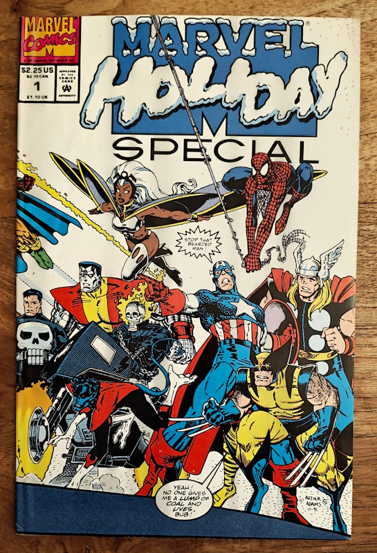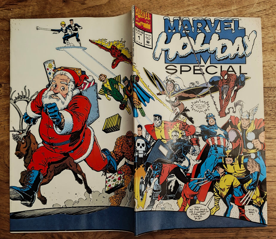 Arthur Adams Wraparound Cover. X-Men in "A Miracle a Few Blocks Down from 32nd Street" by Scott Lobdell & Dave Cockrum. Fantastic Four in "A Christmas Coda" by Walt Simonson & Art Adams. Punisher in "Midnight Drear" by Steven Grant & Klaus Janson. Thor in "Twas a Midwinter's Night" by Tom DeFalco & Sal Buscema. Captain America in "Precious Gifts" by Len Kaminski & Ron Lim. Ghost Rider in "Ghosts of Christmas Past" by Howard Mackie & John Hebert. Captain Ultra in "It Came and Went on a Midnight Clear" by Scott Lobdell & Dennis Jensen. Spider-Man in "A Spider-Man Carol" by Danny Fingeroth & Ron Garney.