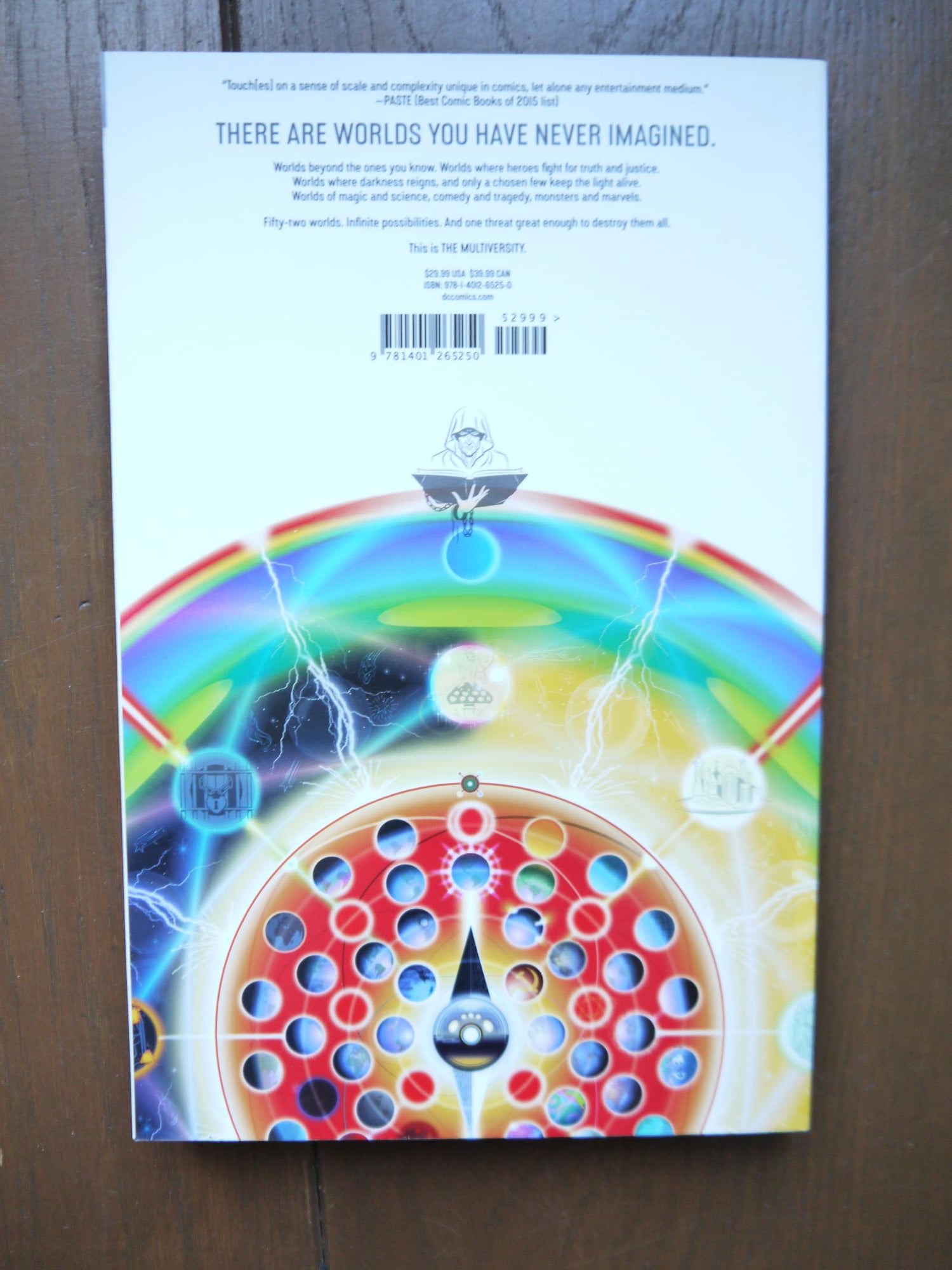 Written by Grant Morrison. Art by Ivan Reis, Joe Prado, Jim Lee, Frank Quitely, Ben Oliver, Chris Sprouse, Cameron Stewart, Doug Mahnke, Scott Williams, Karl Story and Christian Alamy, with Marcus To, Paulo Siqueira, Bryan Hitch, David Finch, Darwyn Cooke, Jon Bogdanove, Brett Booth, Jae Lee, Nicola Scott, Chris Burnham, Dan Jurgens, Giuseppe Camuncoli, Yildiray Cinar, Declan Shalvey, Gary Frank, Gene Ha, Mike Hawthorne, Scott Hepburn, Jeff Johnson, Kelley Jones, Emanuela Lupacchino, Todd Nauck, Duncan Rouleau and Juan Jose Ryp. Cover by Ivan Reis and Joe Prado. The biggest adventure in DC's history is here! Join visionary writer Grant Morrison, today's most talented artists, and a cast of unforgettable heroes from 52 alternative Earths of the DC Multiverse! Prepare to meet the Vampire League of Earth-43, the Justice Riders of Earth-18, Superdemon, Doc Fate, the super-sons of Superman and Batman, the rampaging Retaliators of Earth-8, the Atomic Knights of Justice, Dino-Cop, Sister Miracle, Lady Quark, and the latest, greatest superhero of Earth-Prime: YOU! This title collects all nine MULTIVERSITY issues, plus the indispensable GUIDEBOOK!