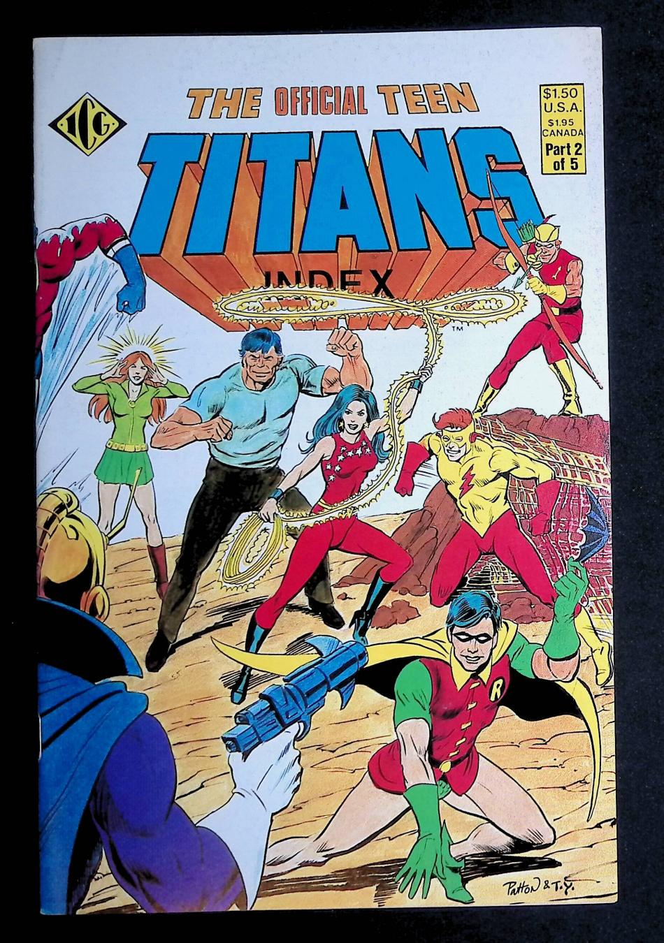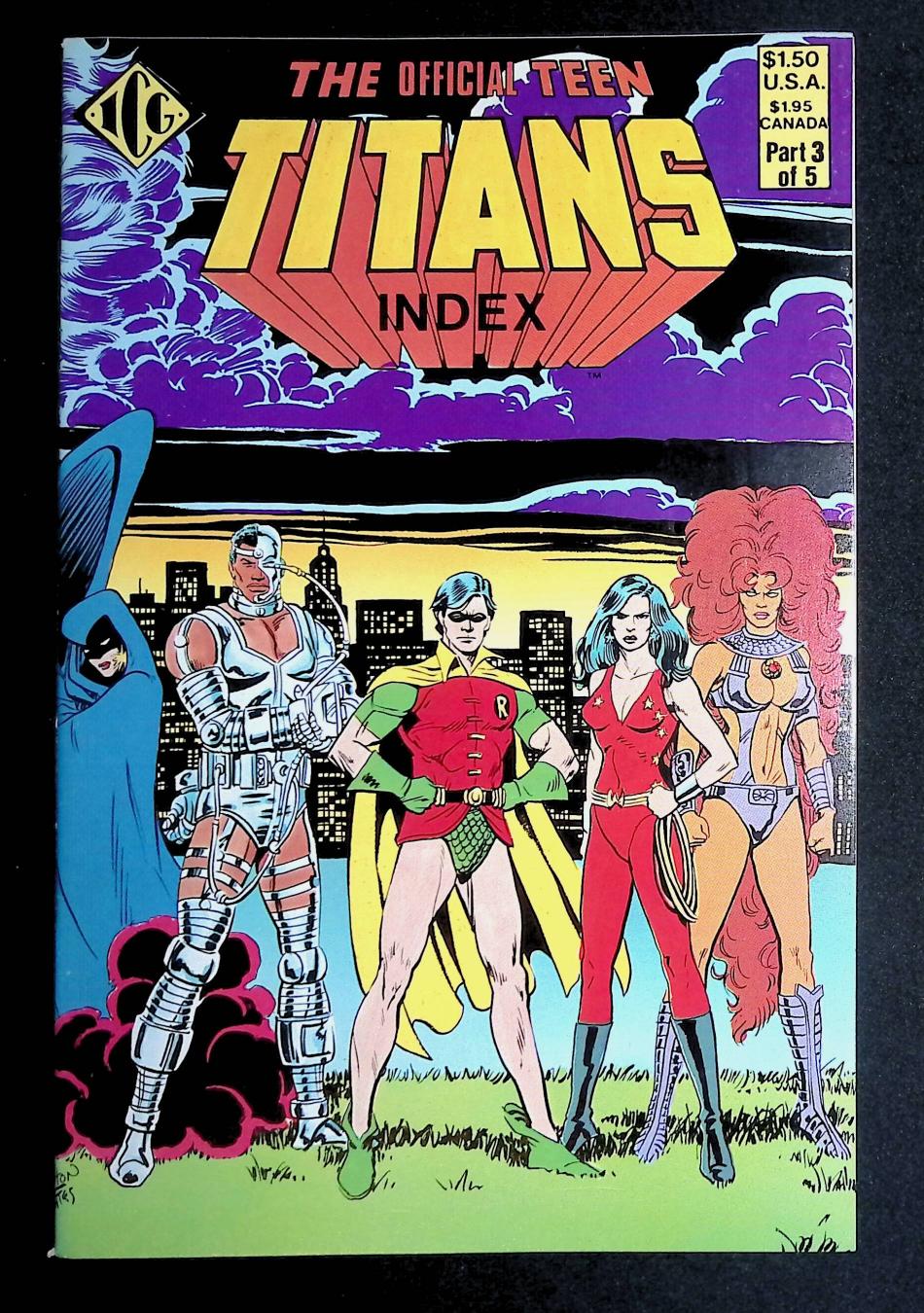 First 14 pages devoted to profiles of the following Teen Titans: Nightwing, Kid Flash, Aqualad, Wonder Girl, Speedy, Hawk, Dove, Lilith, Mal, Gnarrk, Harlequin, Changeling, Bumblebee, Bat-Girl, Golden Eagle, Raven, Starfire, Cyborg, Terra, Jericho. Index of Brave and the Bold (1955-1983 1st Series) #54, 60, Showcase (1956-1978) #59, Teen Titans (1966 1st Series) #1-22.