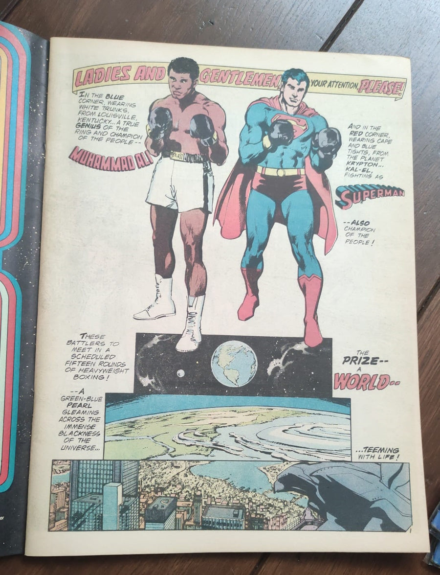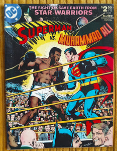 DC EDITION. All-New Collectors' Edition: Superman vs. Muhammad Ali. Cover art by Neal Adams. Backed by an armada of 100 powerful warships orbiting the planet, Rat'Lar demands that Earths greatest champion battle the mightiest Scrubb warrior. Ali and Superman each argue that they should be chosen as champ, with Rat'Lar insisting that the dueling duo fight one another to determine Earths true champion. To make things fair for Earthling Ali, the match takes place on Rat'Lars home planet, Bodace, which has a red sun.