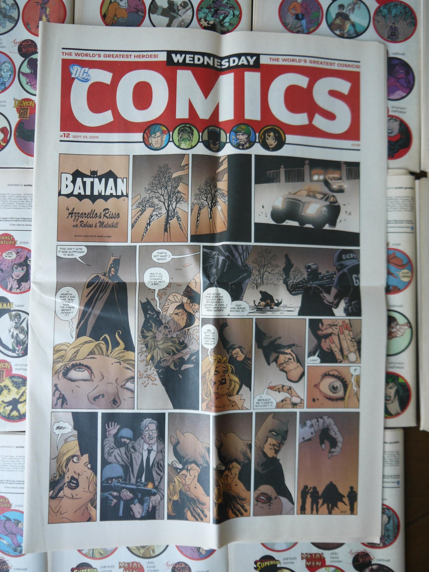 Spearheaded by DCU Editorial Art Director Mark Chiarello, whose past editing credits include BATMAN BLACK & WHITE, DC: THE NEW FRONTIER and SOLO, each page of WEDNESDAY COMICS spotlights the continuing adventures of DC heroes, including: o BATMAN, WEDNESDAY COMICS' weekly cover feature, by the Eisner Award-winning 100 BULLETS team of writer Brian Azzarello and artist Eduardo Risso o ADAM STRANGE, by writer/artist Paul Pope (BATMAN: YEAR 100) o METAMORPHO, written by New York Times best-selling writer Neil Gaiman with art by Eisner Award-winner Michael Allred (Madman) o THE DEMON AND CATWOMAN, written by Walter Simonson (Thor, MANHUNTER) with art by famed DC cover artist Brian Stelfreeze o DEADMAN, written by Dave Bullock and Vinton Heuck, art by Dave Bullock o KAMANDI, written by Dave Gibbons (WATCHMEN, GREEN LANTERN CORPS) with art by Ryan Sook (Buffy The Vampire Slayer, ARKHAM ASYLUM: LIVING HELL) o SUPERMAN, written by John Arcudi (The Mask) with art by Lee Bermejo (JOKER) o WONDER WOMAN, written and illustrated by Ben Caldwell (Dare Detectives) o GREEN LANTERN, written by Kurt Busiek (TRINITY, ASTRO CITY) with art by Joe Quiñones (TEEN TITANS GO!) o TEEN TITANS, written by Eddie Berganza with art by Sean Galloway o SUPERGIRL, written by Jimmy Palmiotti (JONAH HEX) with art by Amanda Conner (POWER GIRL) o HAWKMAN, written and illustrated by Kyle Baker (PLASTIC MAN, Special Forces) o SGT. ROCK, written by Adam Kubert (SUPERMAN: LAST SON), ilustrated by legendary comics artist Joe Kubert o THE FLASH, written by Karl Kerschl (TEEN TITANS YEAR ONE, THE FLASH: THE FASTEST MAN ALIVE) and Brenden Fletcher, illustrated by Karl Kerschl o METAL MEN, written by Dan DiDio with art by Ian Churchill (SUPERGIRL)