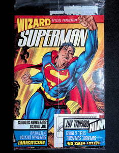 Polybagged w/Joe Madureira poster and Daily Planet press pass. Title reads Wizard Special Publication Superman. Wizard Special Publication. Manual of Steel - get the skinny on the Man of Steel; Joey Cavalieri Q & A on Superman's appeal, the challenge of handling an icon, and fans' reaction to the 'Electric Superman'; Reign of the Supermen - Superman's creators reveal what's next for the Man of Steel now that he's back in one super-body; The Next Generation - Supes' creators explain what's in store for Superman's super family; Wizard's Guide to Metropolis; Fortress of Solitude - catch a sneak peek at his home away from home (by Tom Grummett); Superman's friends and enemies; Superest Supes Stories Of All Time; Superman Lives - does the Man of Steel have what it takes to be a movie icon again?; Superman Trivia Challenge; Great Krypton - Krypton really exists. Cover by Jerry Ordway. Cover price $3.99.