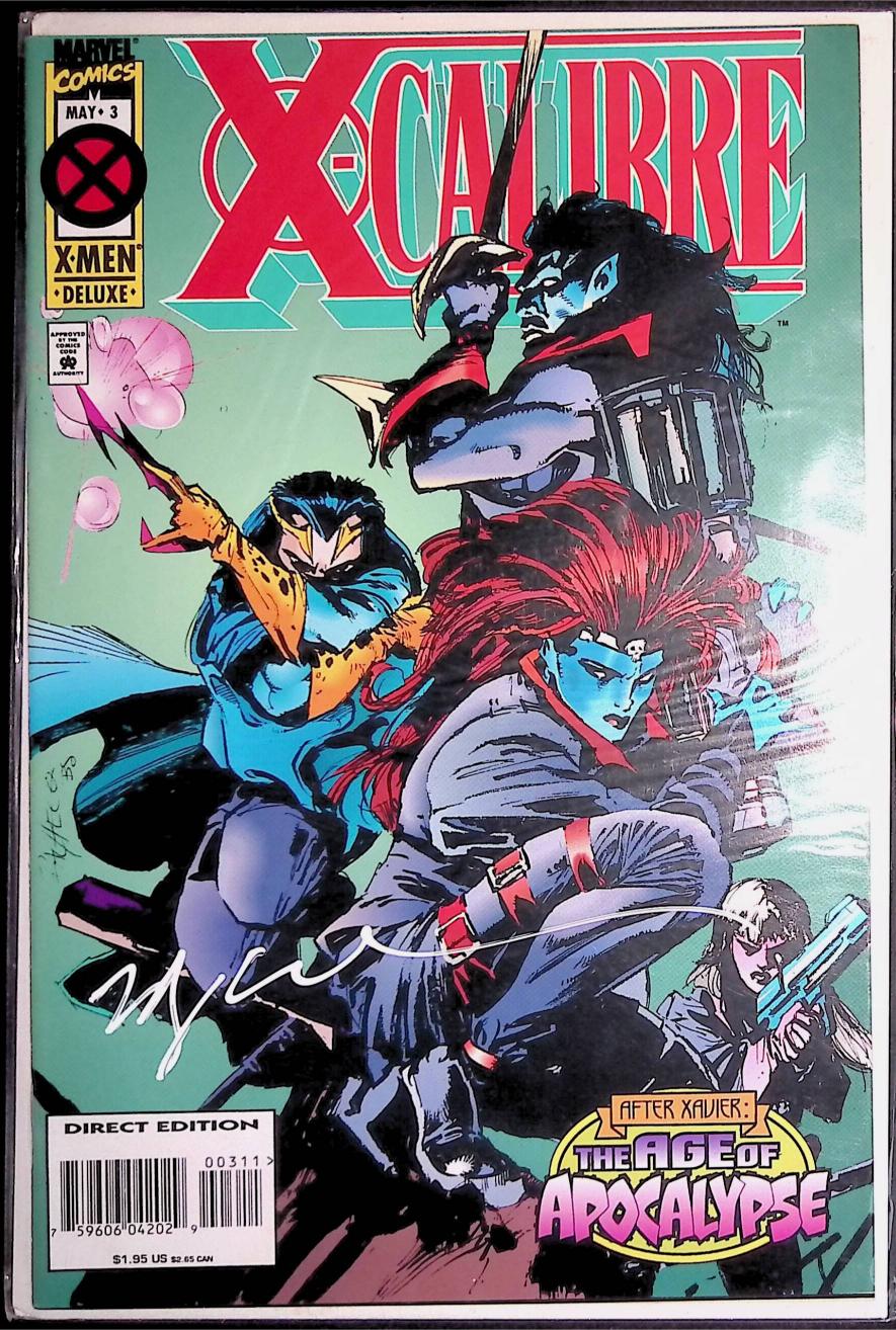 Cover pencils by Carlos Pacheco, inks by Bill Sienkiewicz. Age of Apocalypse; "Body Heat," script by Warren Ellis, pencils by Ken Lashley, inks by Tom Wegrzyn and Phil Moy; Nightcrawler is reunited with his mother; He and Mystique travel to Avalon and meet with Destiny where they learn of Avalon's imminent fall; Damask and Wade follow the heroes and arrive at Avalon themselves; Damask is enchanted by the hidden paradise and switches sides; She helps the heroes kill Wade and joins the battle to defend Avalon from Apocalypse. Text piece about X-Universe. 36 pgs., full color. $1.95. Cover price $1.95.